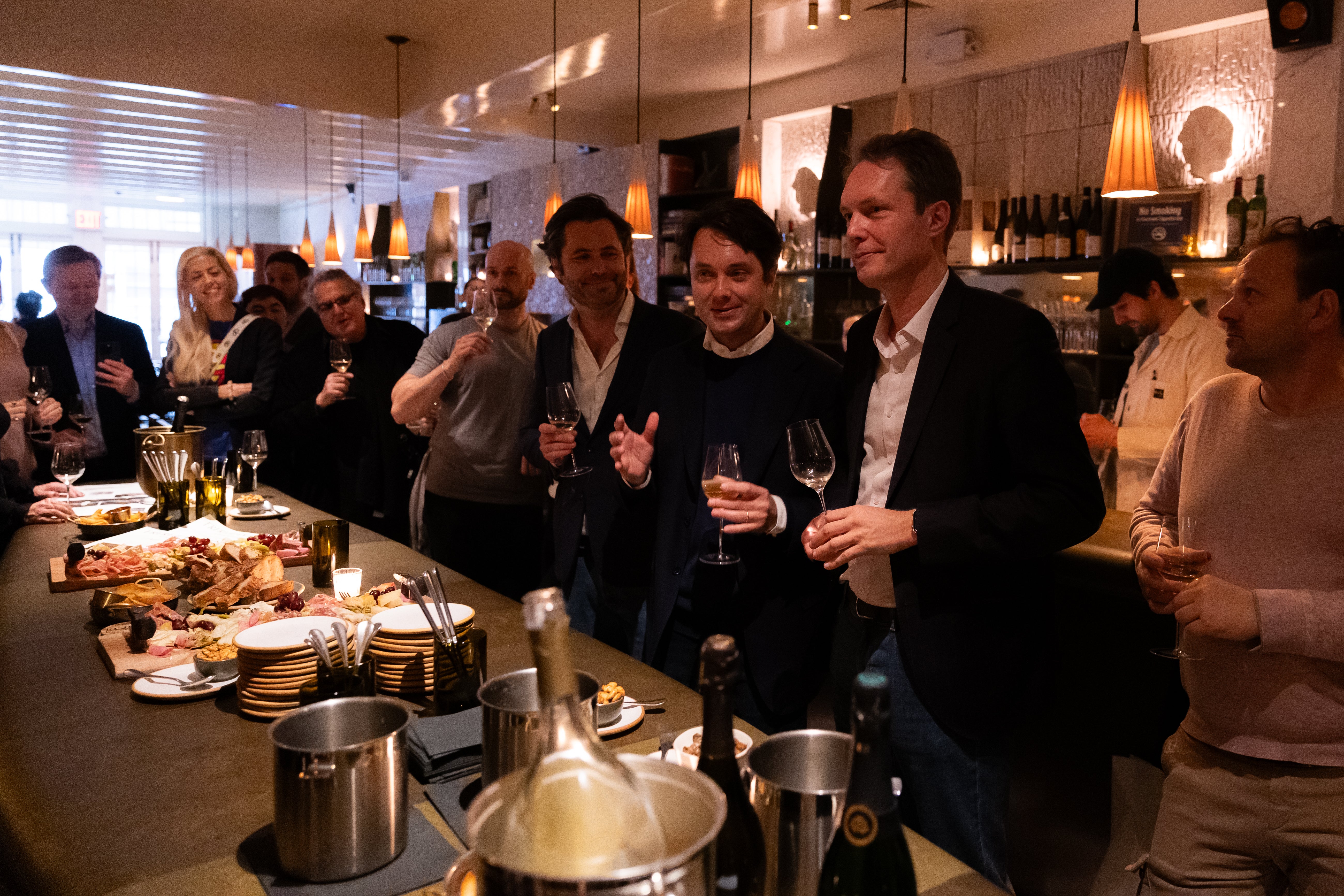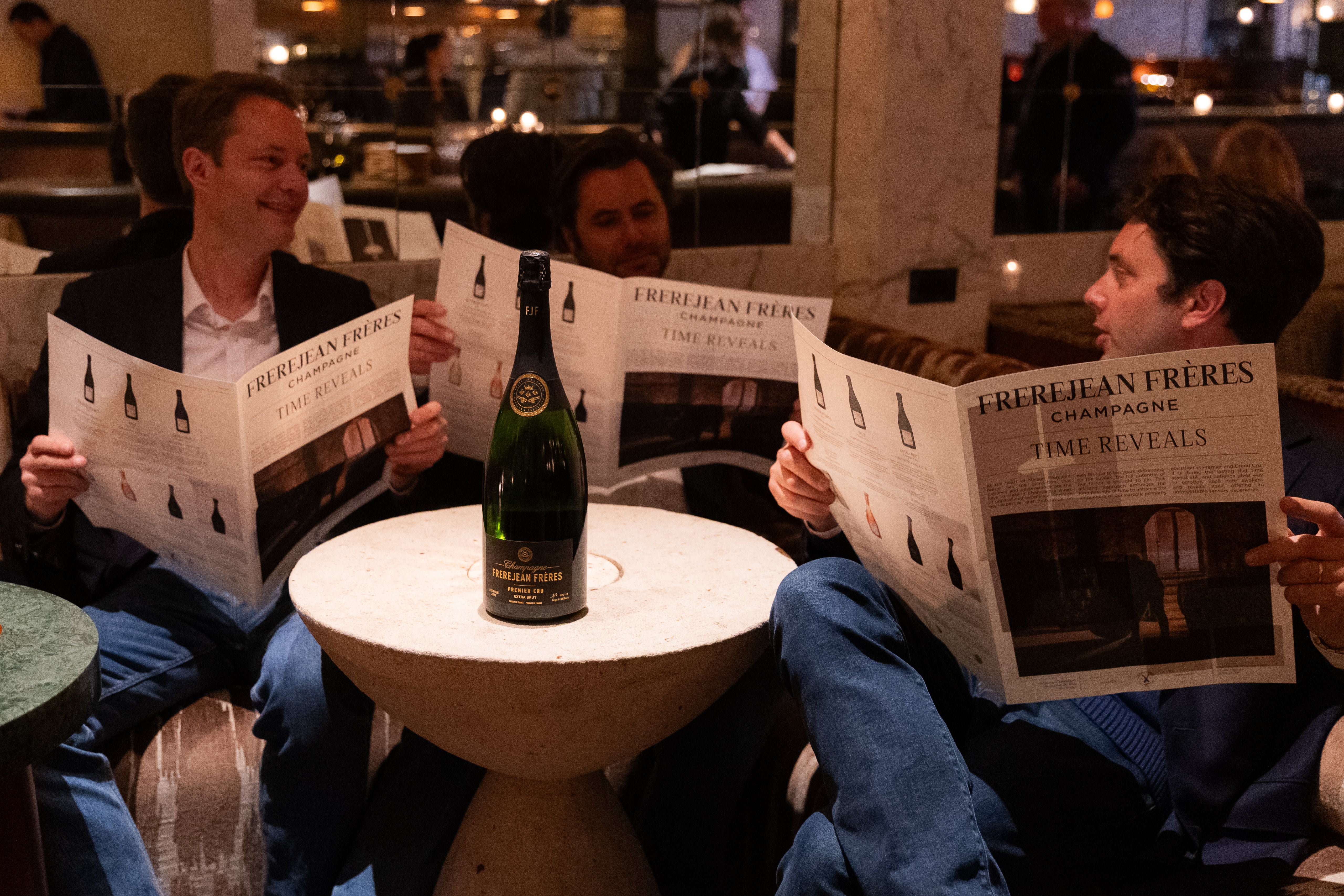 The three brothers Guillaume Frerejean Taittinger, Richard Frerejean Taittinger, and Rodolphe Frerejean Taittinger gathered for an intimate dinner in New York City at the La Compagnie des Vins Surnaturels, Flatiron, surrounded by our close partners, to present our new identity, guided by our philosophy: Time reveals.